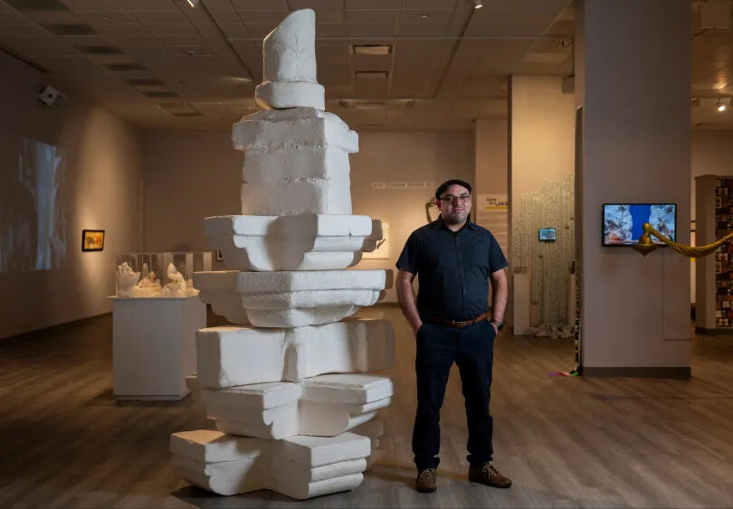 Shaurya Kumar poses next to his sculpture “What is Seen and Unseen: Mapping South Asian American Art in Chicago” on display at the South Asia Institute in Chicago, Oct. 24, 2024. (Vincent Alban/for the Chicago Tribune)